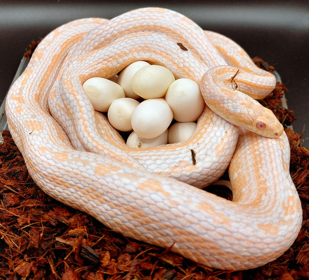 11-04-2026: The first eggs of this season. Red factor, tessera, motley hypo snow x red factor tessera, motley, snow het. hypo. So be ready for extreme pink offspring!